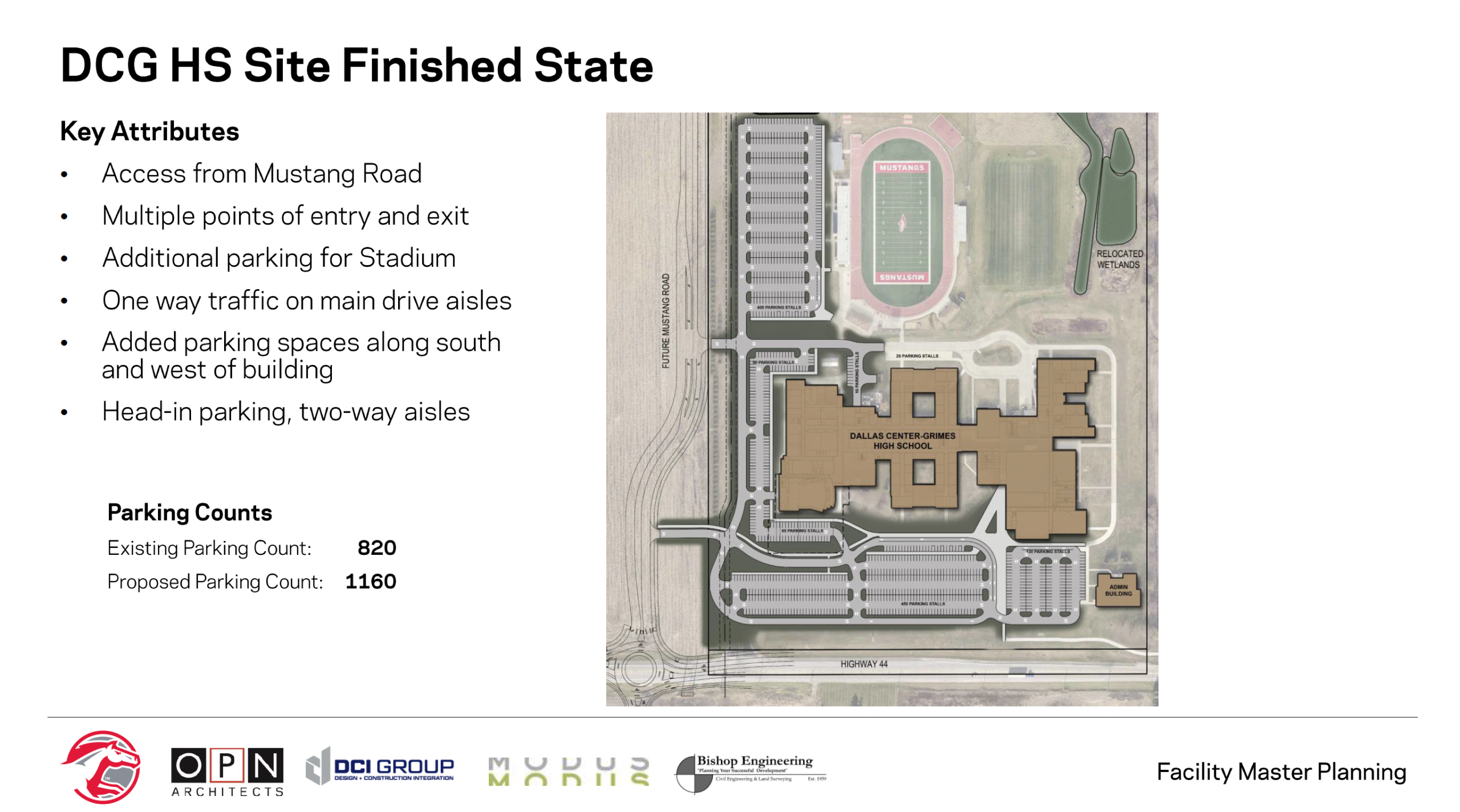Dallas Center-Grimes CSD completed a facilities master plan project with OPN Architects in the spring of 2025. Community leaders from the DCG Facilities team canvassed the community to circulate a bond petition ahead of the DCG School Board Meeting on August 25, 2025. On November 4, residents of the Dallas Center-Grimes Community School District will have the opportunity to vote to allow the district to use a general obligation bond to pay for improvements to multiple district facilities.