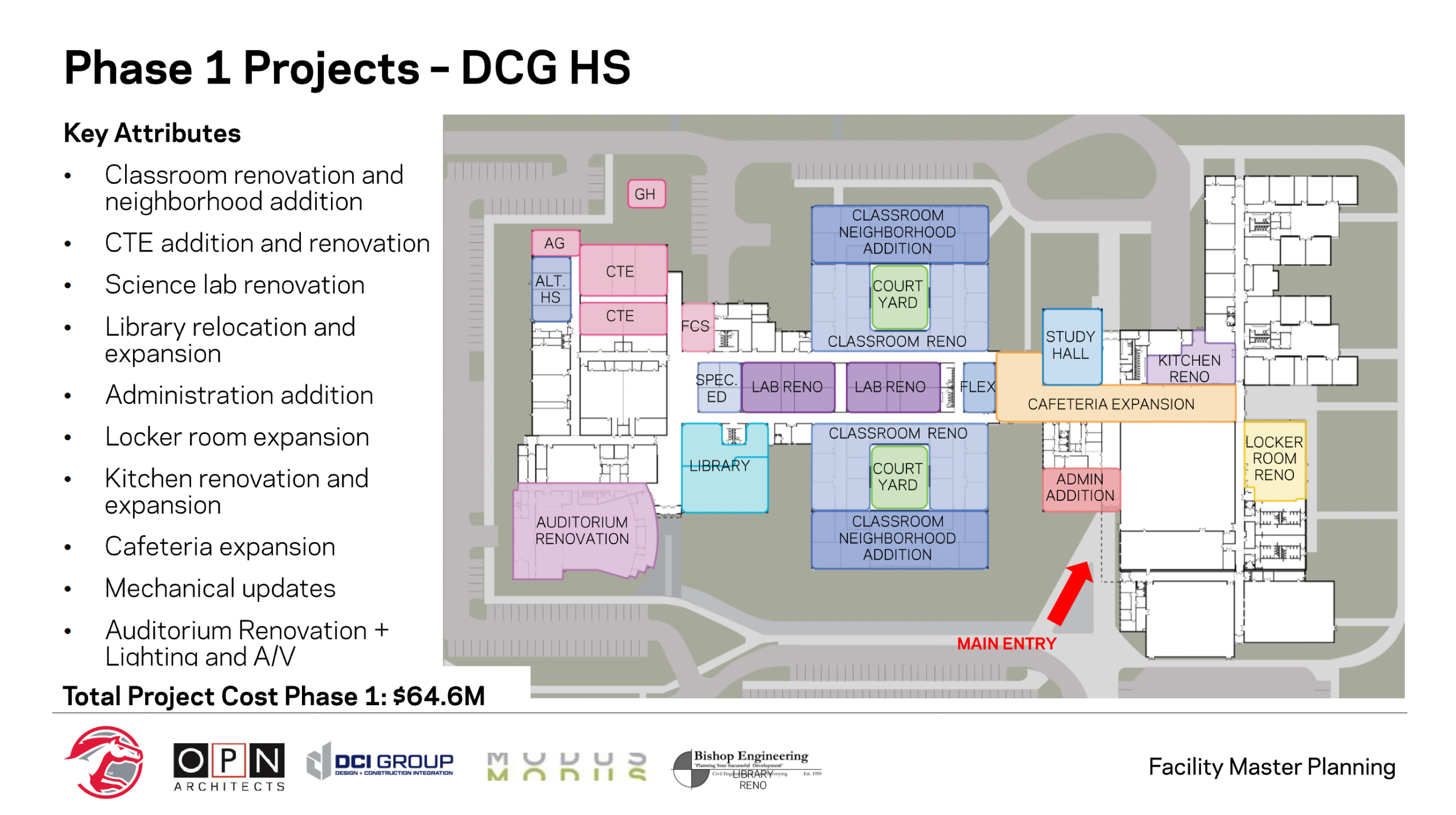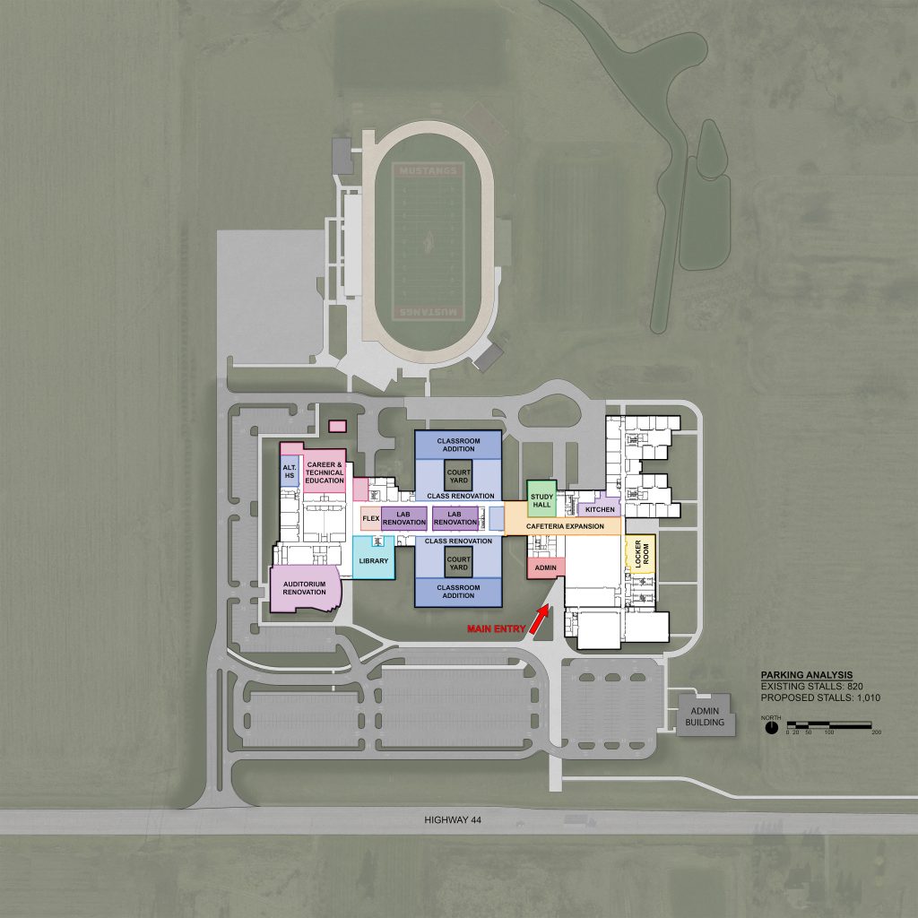 - Additions and renovations including classrooms, labs, CTE, library, kitchen, cafeteria, locker rooms, alternative education