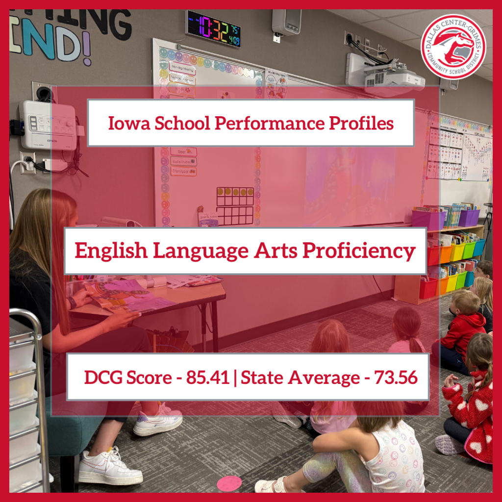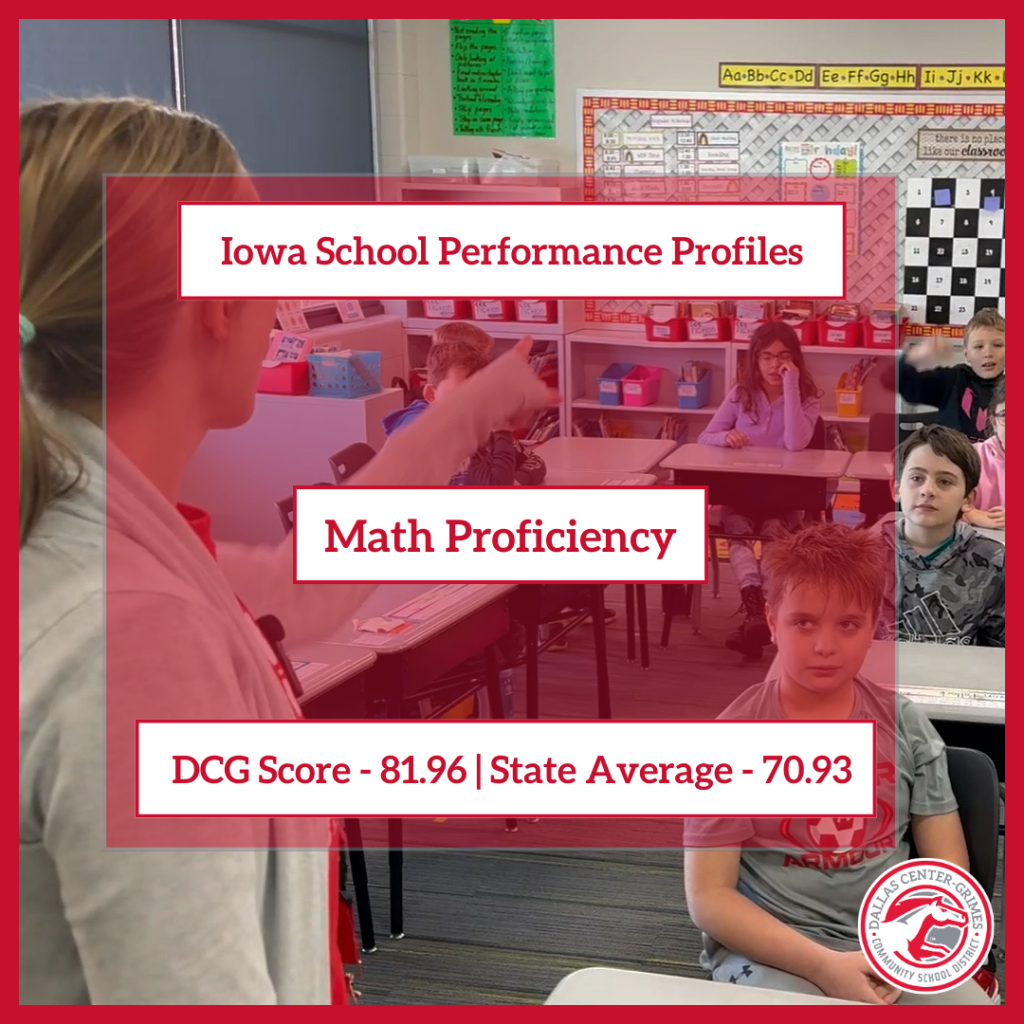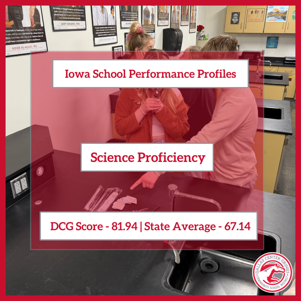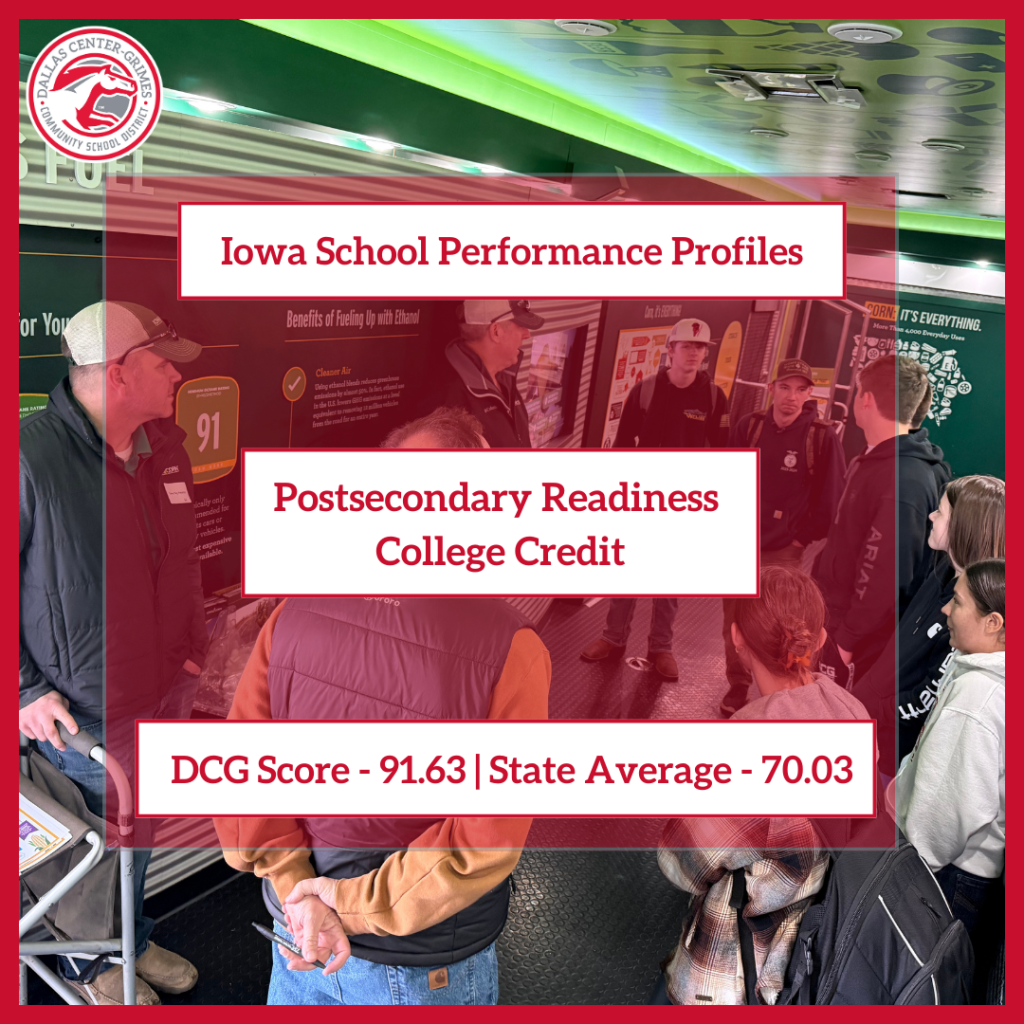 The Iowa Department of Education released district ratings as part of the 2024-2025 Iowa School Performance Profiles. Dallas Center-Grimes CSD received a “High Performing” rating, placing our district in the top 25% of districts in Iowa! DCG’s score of 71.26% (641.38 out of 900 possible points) is 8% better than the statewide average in the 2025 reporting year!