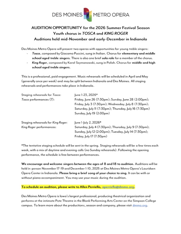 Details: Des Moines Metro Opera will present two operas with opportunities for young treble singers: – Tosca, composed by Giacamo Puccini, sung in Italian . Chorus for elementary and middle school aged treble singers. There is also one brief solo rolefor a member of the chorus. – King Roger, composed by Karol Szymanowski, sung in Polish. Chorus for middle and high school aged treble singers. This is a professional, paid engagement. Music rehearsals will be scheduled in April and May (generally once per week) and may be split between Indianola and Des Moines. All staging rehearsals and performances take place in Indianola. Staging rehearsalsfor Tosca: June 1-23, 2026* Toscaperformances(7): Friday, June 26(7:30pm); Sunday, June 28(2:00pm); Friday, July 3 (7:30pm); Wednesday, July 8(7:30pm); Saturday, July 11(7:30pm); Thursday, July 16(7:30pm) Sunday, July 19(2:00pm) Staging rehearsals for King Roger: June 1-July 2, 2026* King Rogerperformances: Saturday, July 4 (7:30pm); Thursday, July 9 (7:30pm); Sunday, July 12 (2:00pm); Tuesday, July 14 (7:30pm); Friday, July 17 (7:30pm)