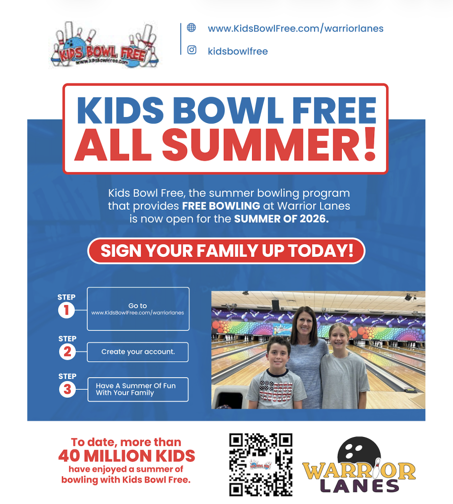 Details: Kids Bowl Free, the summer bowling program that provides Free Bowling at Warrior Lanes is now open for the Summer of 2026!